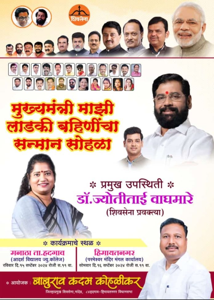 आपल्या हदगाव हिमायतनगर तालुक्यामध्ये शिवसेना प्रवक्त्या डॉ.ज्योतीताई वाघमारे यांच्या प्रमुख उपस्थितीत शिवसेना जिल्हाप्रमुख बाबुरावजी कदम कोहळीकर यांनी मुख्यमंत्री माझी लाडकी बहिणींचा सन्मान सोहळा आयोजित केला आहे तरी या कार्यक्रमांचा जास्तीत जास्त लाडक्या बहिणींनी लाभ घ्यावा.