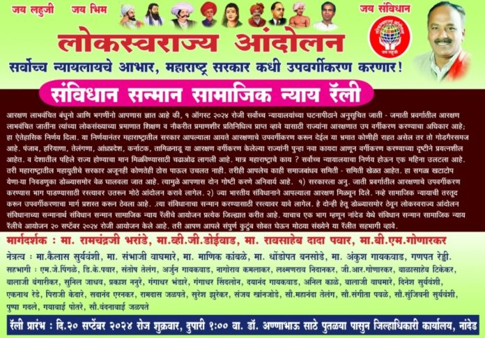 या संविधान सन्मान सामाजिक न्याय रॅलीमध्ये सर्वोच्च न्यायालयाने अनुसूचित जाती उपवर्गीकरण आरक्षणा विषयी दिलेल्या निर्णयाचे न्यायालयाविषयी आभार व महाराष्ट्र सरकार कधी उपवर्गीकरणाचा विषय मार्गी लावणार? याविषयीचे सखोल असे मार्गदर्शन करण्यात येणार आहे.या सामाजिक न्याय रॅली मध्ये लोकस्वराज्य आंदोलन संघटनेचे प्रमुख प्रा.रामचंद्रजी भरांडे सर, मा.व्ही.जी.डोईवाड मा. रावसाहेबदादा पवार,नागोराव नामेवार सर,पंडित अंबुलगेकर, आदी मान्यवर आपले मनोगत व्यक्त करणार आहेत.