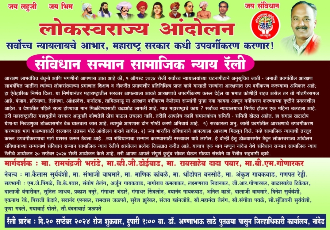 यासाठी लोकस्वराज्य आंदोलन महाराष्ट्र आयोजित येत्या दिं.२० सप्टेंबर २०२४ रोज शुक्रवारी दुपारी ठिक ०१:०० वाजता सत्यशोधक डॉ.अण्णाभाऊ साठे यांच्या पुतळ्या शेजारी पासुन ते भारतरत्न डॉ.बाबासाहेब आंबेडकर यांच्या पुतळ्यापर्यंत संविधान सन्मान सामाजिक न्याय रॅलीचे आयोजन करण्यात आले आहे.ही रॅली अतिशय मोठ्या ताकदीने पूर्ण करण्यात येणार आहे.