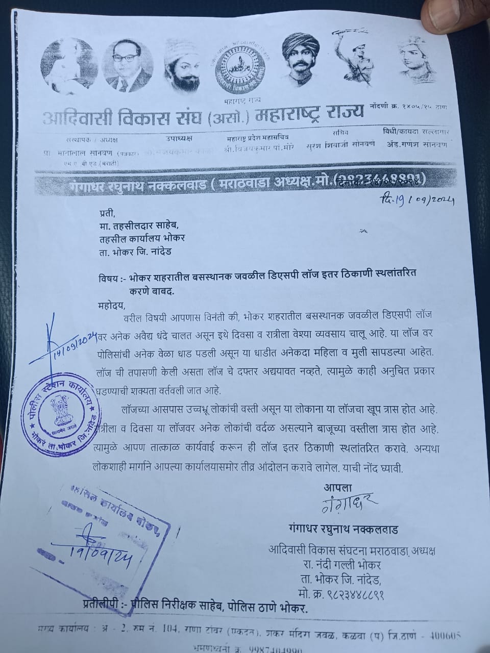 आदिवासी विकास संघटना मराठवाडा अध्यक्ष रा. नंदी गल्ली भोकर ता. भोकर जि. नांदेड, याचे आशेचे निवेदन मा.तहसीलदार साहेब कार्यालय भोकर तालुका भोकर जिल्हा नांदेडपोलीस निरीक्षक साहेब पोलीस ठाणे भोकर यांना निवेदनाद्वारे कळविण्यात आले आहे यावर त्वरित अंमलबजावणी न झाल्यास तीव्र स्वरूपाचे लोकशाही मार्गाने आंदोलन करण्यात येणार असल्याची माहिती आदिवासी विकास संघटना मराठवाडा अध्यक्ष गंगाधर रघुनाथ नक्कलवाड यांनी दिली आहे