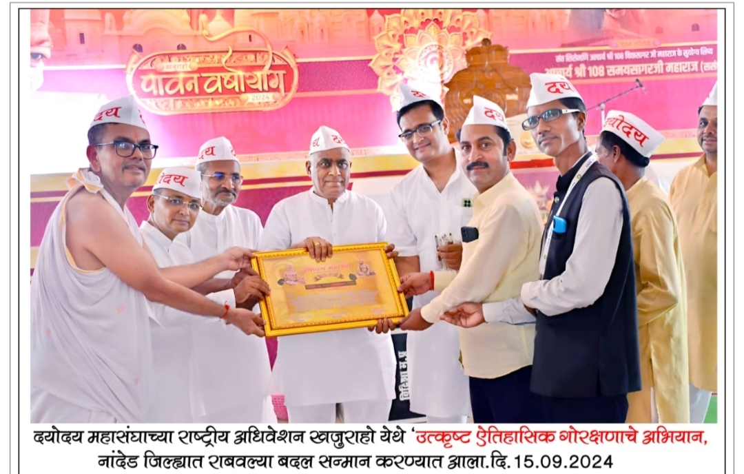 नांदेड जिल्ह्यात अतिशय प्रतीकुल परीस्थितीचा सामना करत मागील 1 वर्षात केलेल्या ऐतिहासिक गोरक्षणाच्या यशस्वी लढ्याची दखल घेऊन राष्ट्रीय अध्यक्ष श्री प्रेमचंद जैन प्रेमी, राष्ट्रीय मंत्री श्री राकेश जैन, महाराष्ट्र प्रभारी श्री तुषारजी जैन आणि श्री ऊध्दवजी नेरकर, सदस्य गोसेवा आयोग महाराष्ट्र राज्य यांच्या हस्ते सन्मानित करण्यात आले आहे.