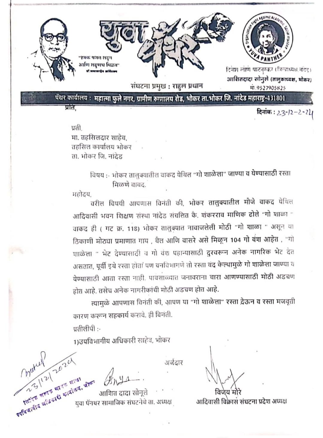 आदिवासी विक्लास संघटना प्रदेश अध्यक्ष यांनी भोकरदन तहसीलदार यांना निवेदनाद्वारे मागणी केले आहे