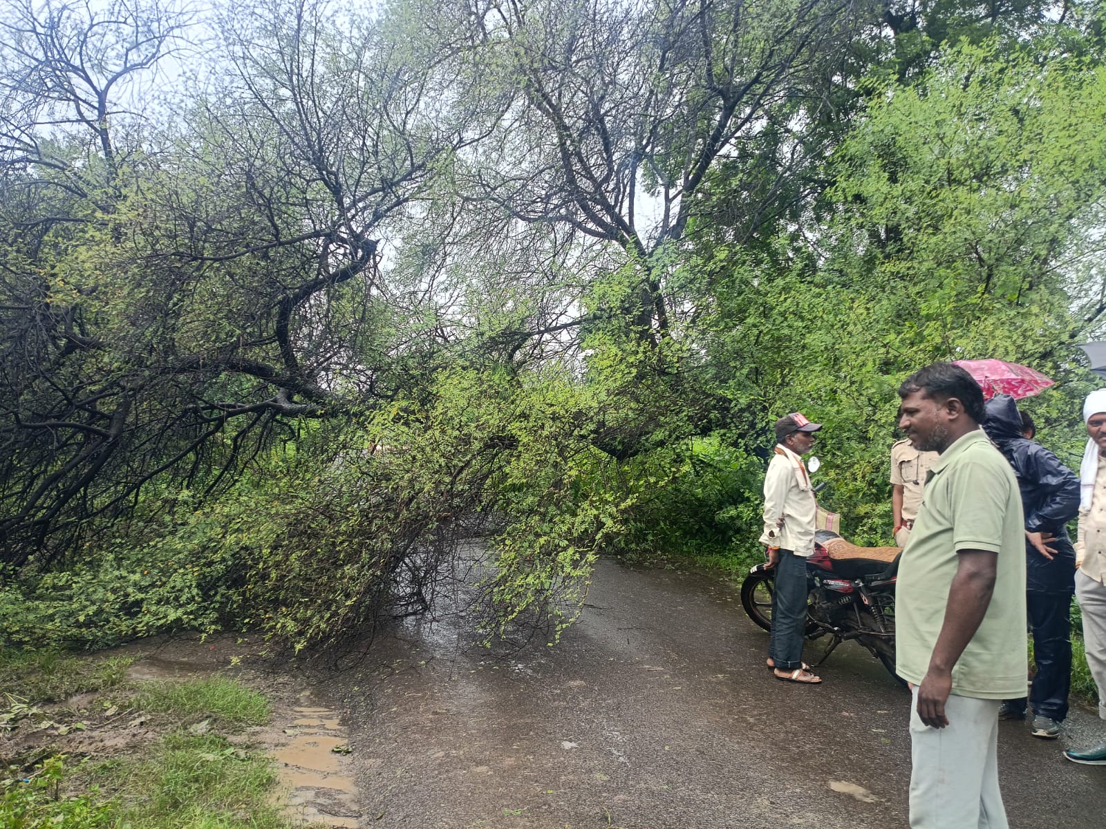 याचाच फटका वृक्षांना हा बसत आहे गेल्या चार-पाच दिवसांपासून सुरू असलेल्या सतत पावसामुळे जमिनीचे मुळे सैल होत असून दिनांक 18 ऑगस्ट रोजी दुपारी दोन वाजता शिंदी ते मेरा खुर्द रस्त्यावर भले मोठे बाभळीचे झाड पडले, सुदैवाने झाड फोडले तेव्हा कुठल्याही प्रकारचे वाहन या ठिकाणी नव्हते, झाड पडल्यामुळे जाण्या-येण्याकरता कुठलाही रस्ता नसल्यामुळे दोन्ही बाजूने वाहनाच्या लांबच लांब रांगा लागल्या होत्या यामध्ये एसटी बस सुद्धा होत्या,सदर घटनेची माहिती शिंदी गावच्या सरपंच सौ साधना खरात यांना मिळताच,